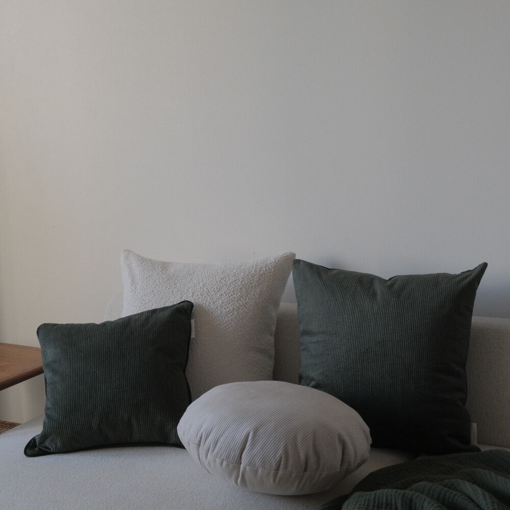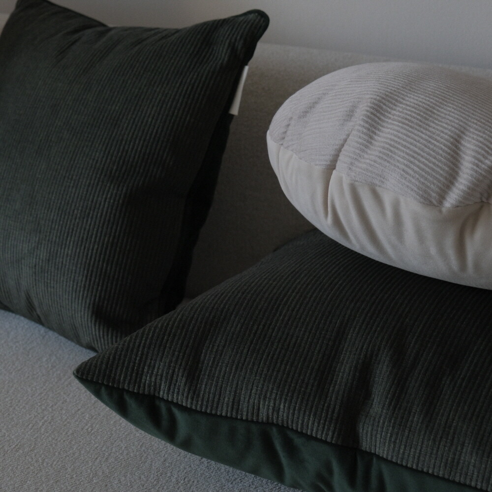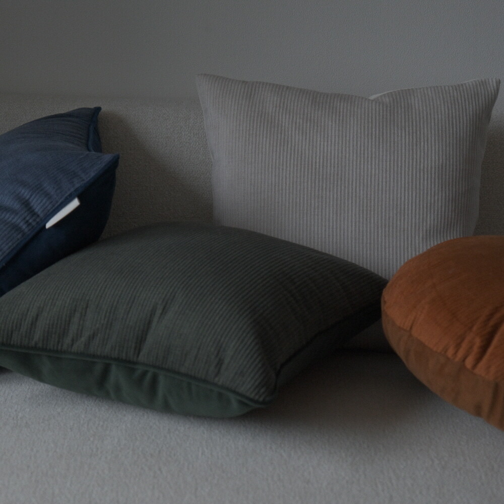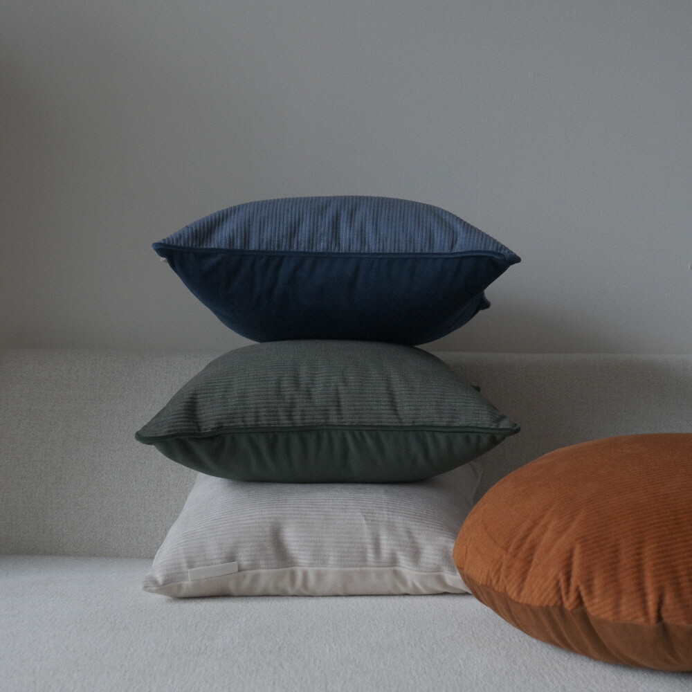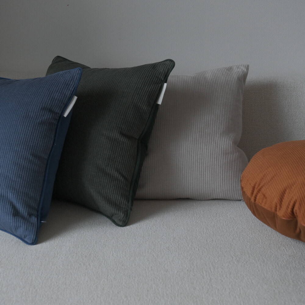 부드러운 터치감의 코듀로이 소재에 뒷면에는 조금 더 딥한 컬러로 벨벳 원단을 코디지로 선택한