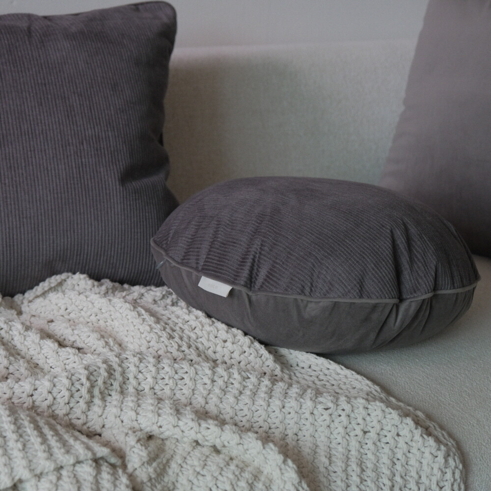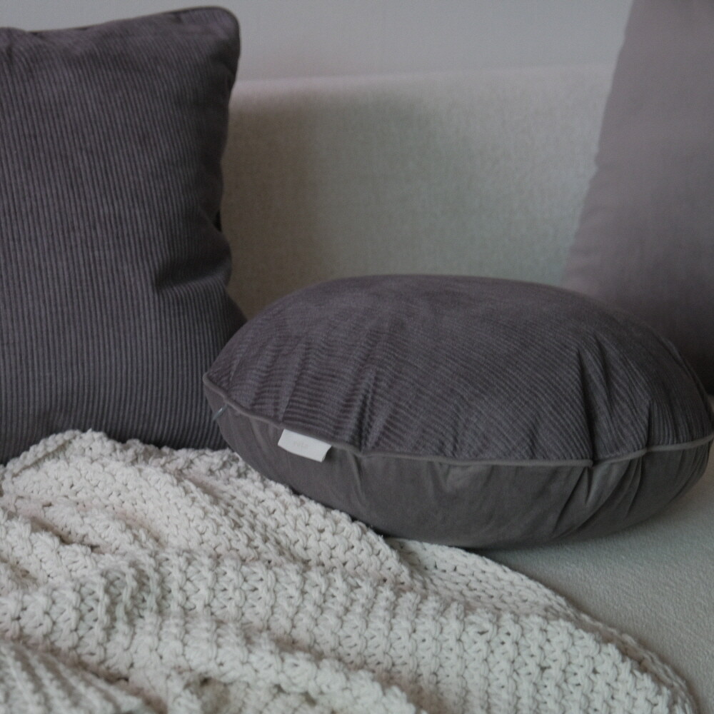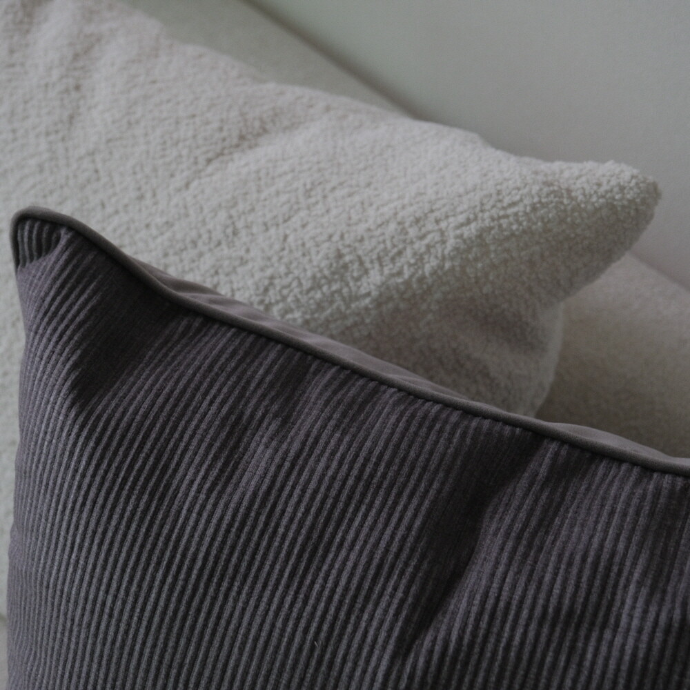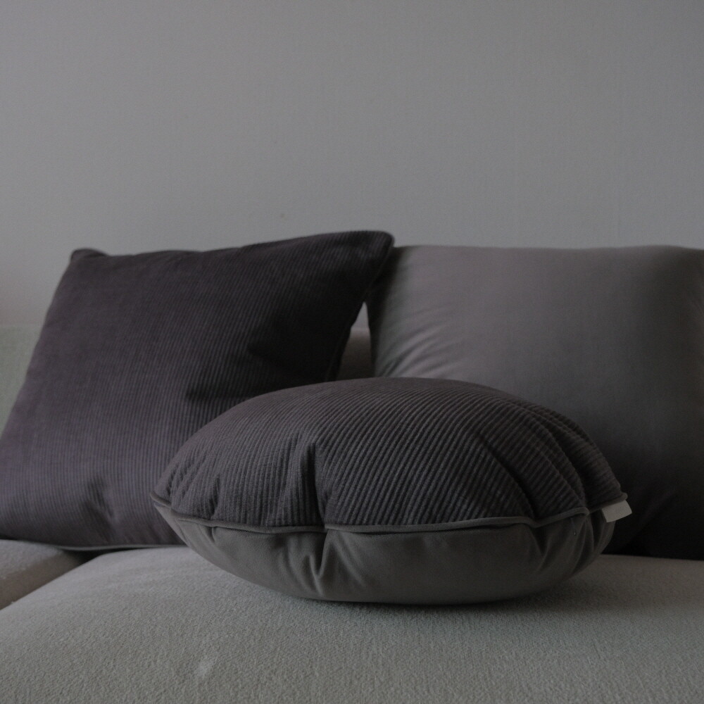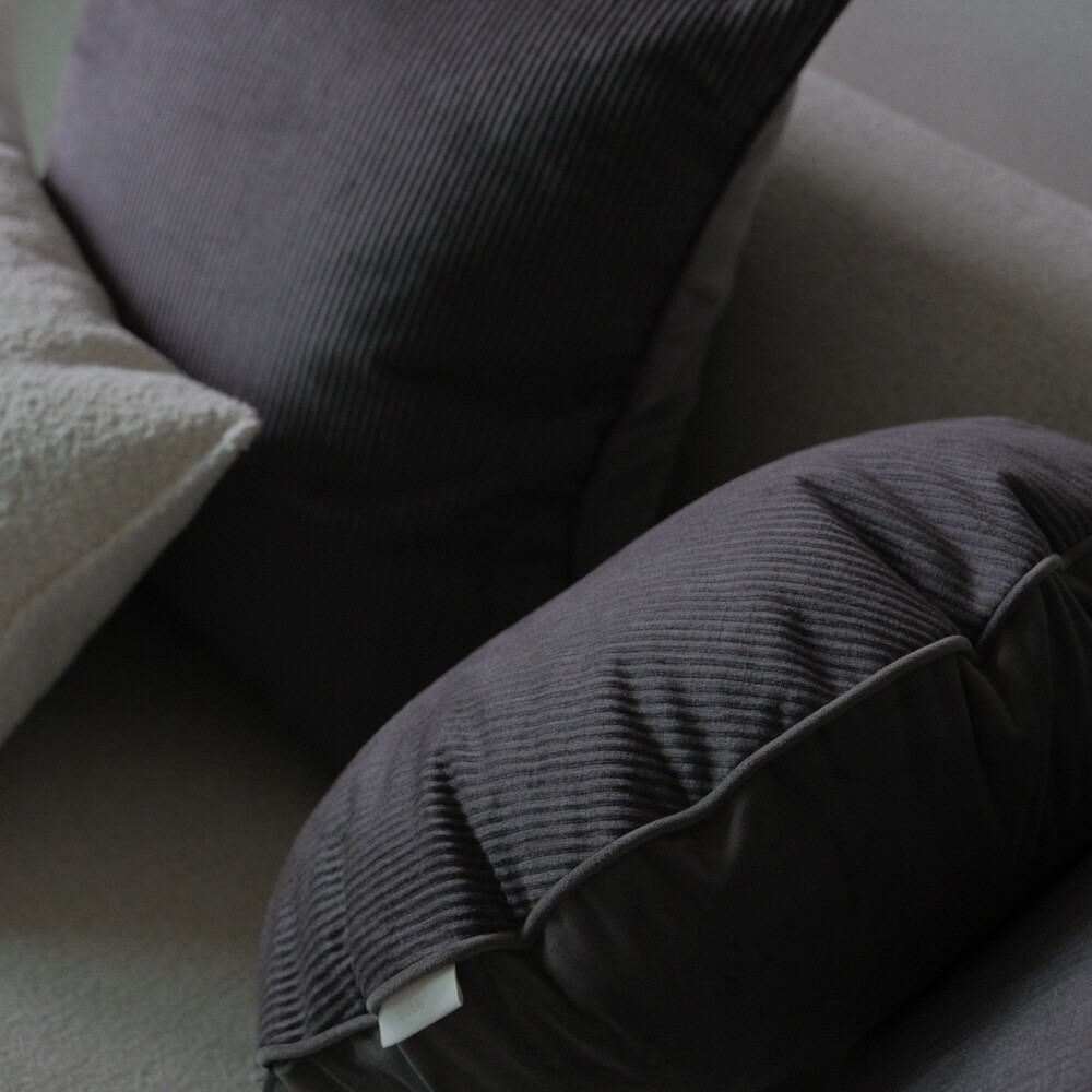부드러운 터치감의 코듀로이 소재에 뒷면에는 조금 더 딥한 컬러로 벨벳 원단을 코디지로 선택한